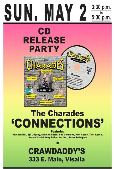 | During this time the group added guitar/sax player Eddie Cuellar to the band. Eddie’s guitar playing added extended styles to the band. Also added were Henry Vasquez on bass and sax and Louis Fernandez on sax. In the years 1963 to 1964 The Charades became the best band performing in the San Joaquin Valley. They continued to play with many Rock & Roll stars of the day including Connie Francis, The Coasters, The Five Satins, The Penguins, Shirley & Lee, The Monotones, The Crests, Jimmy Clanton, Skip & Flip. Recording continued in Los Angeles under the supervision of Anthony Hilder. The last session was in May 1964. Songs recorded were instrumentals “Christina” and “Sophia”. Vocals recorded that day were “Open Up Your Heart”, “Shake, Shout & Soul” and "Bright Star”. Ray Baradat had been drafted and reported to the U.S. Army in June of 1964. Although the group continued to perform for the next two years during Baradat’s departure the group did not record again until the mid 70’s. |